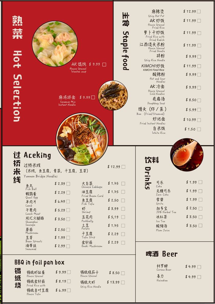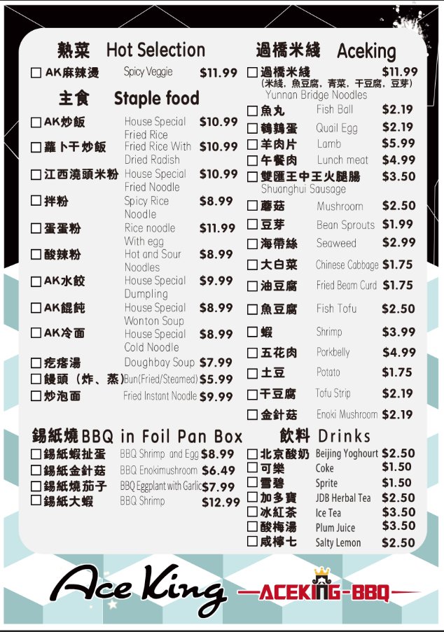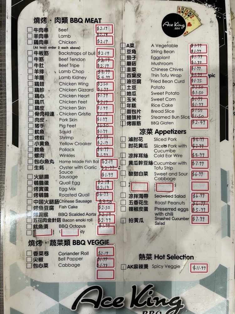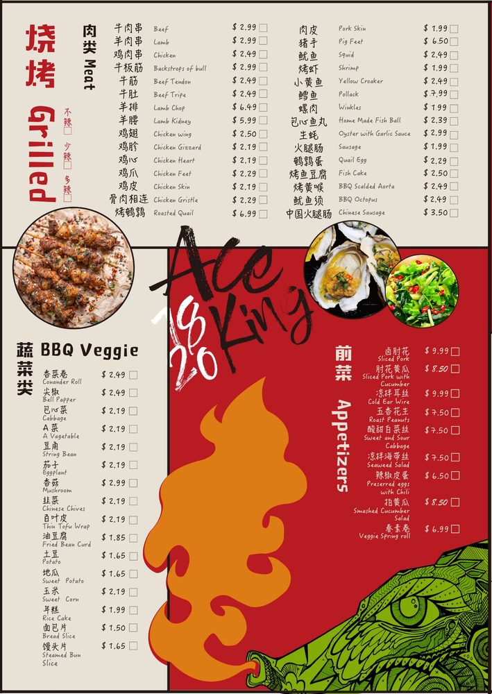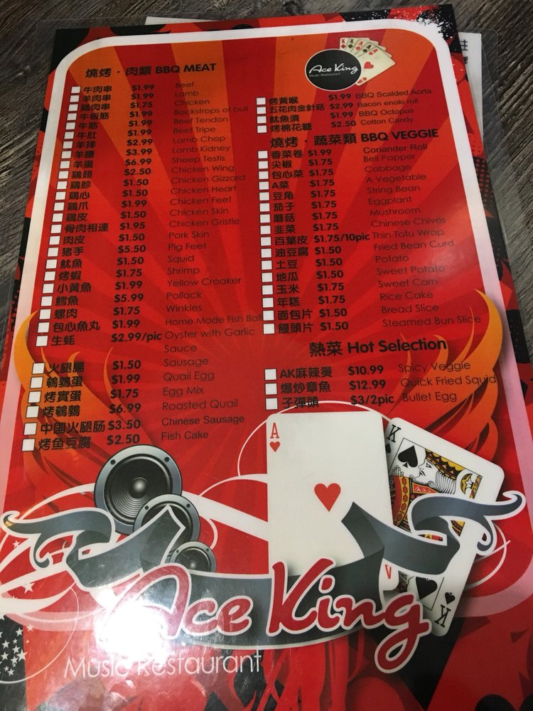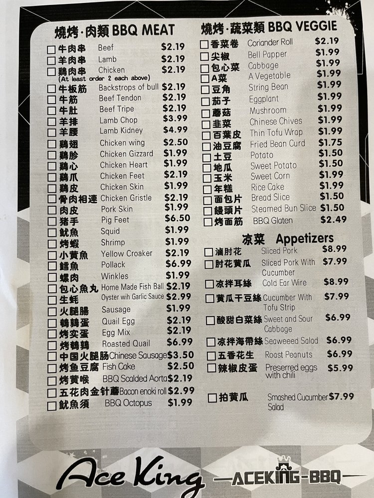 Aceking BBQ, a Chinese - Noodles - Barbeque restaurant located in San Francisco, offers a wide range of options for food enthusiasts. Known for its flavorful skewers, such as chicken skin, gizzards, lamb, and more, this casual yet classy establishment caters to a variety of tastes. Customers rave about the delicious food and fast service, making it a go-to spot for late-night cravings. The intimate ambiance and extensive menu featuring favorites like baonbun slices, beef tripe, and green onions create a memorable dining experience. With offerings like vegetarian options, beer & wine, and outdoor seating, Aceking BBQ provides a vibrant and welcoming atmosphere for groups and families alike. Overall, this gem in the neighborhood stands out for its authentic flavors and satisfying dishes, making it a must-visit for anyone looking for a unique dining experience.